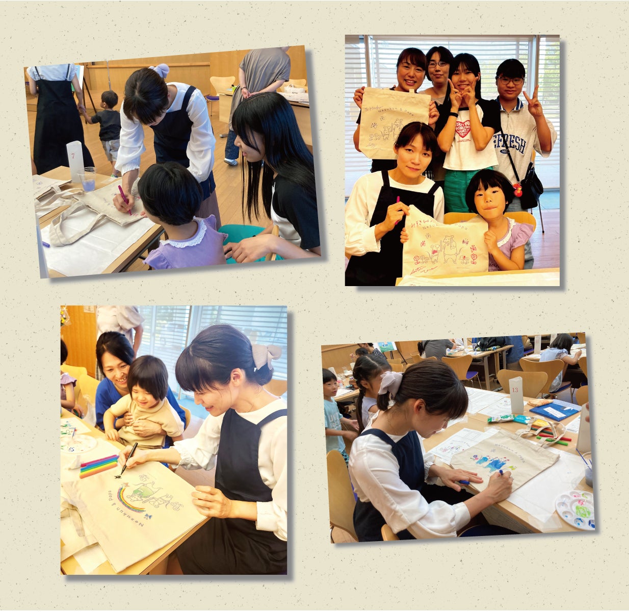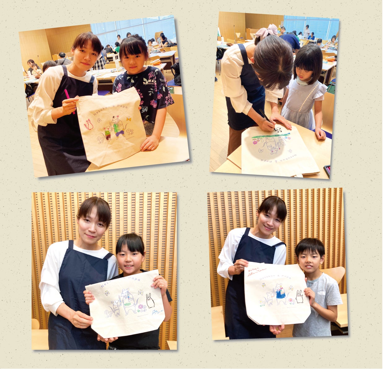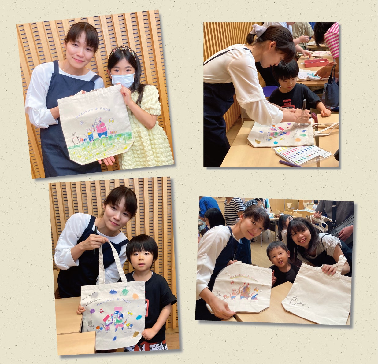 特にワークショップで使用したトートバッグは、ここに彩色することを考え、どんな色を塗っても馴染む色として、主線をライトグレーにしました。ライトグレーのバッグは非売品で、イベント専用のスペシャルバージョンです。そんなレアもののバッグが配られ、ご家族ごとにテーブルに分かれ、作業開始!