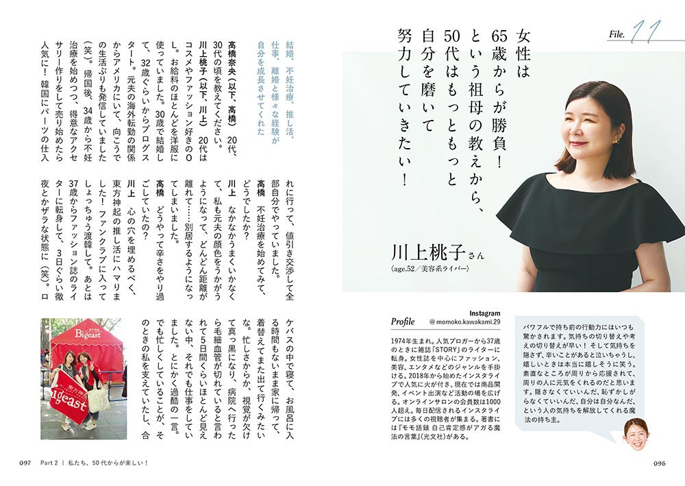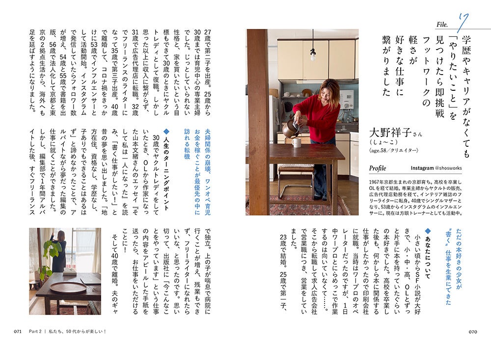 大草直子さん、進藤やす子さん、下河辺さや子さん、しょ〜こさん、赤間麻里子さんなどなど、50代を思いっきり楽しむ19人の方々に、自分らしく生きるためのヒントを教えていただいた一冊です。