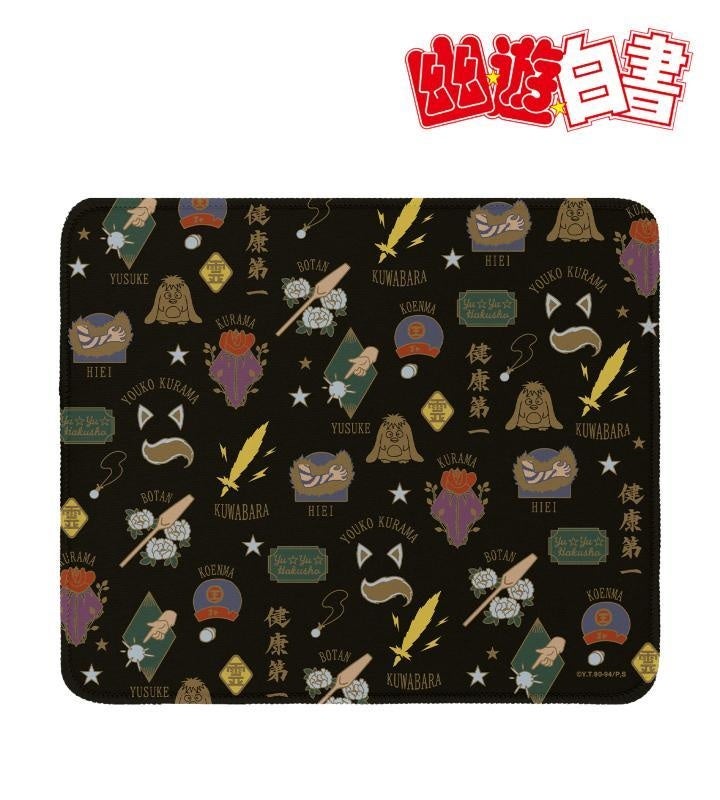 浦飯幽助、桑原和真、飛影、蔵馬、妖狐蔵馬、コエンマ、ぼたん、幻海のモチーフやキャラクター名を色味を抑えたシックなマウスパッドに仕上げました。