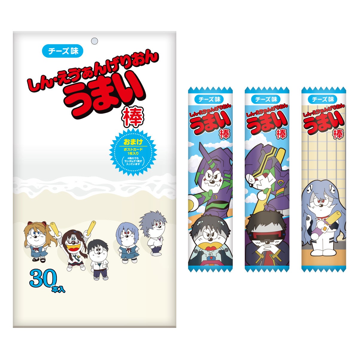国民的アニメーション『シン・エヴァンゲリオン劇場版』と国民的お菓子「うまい棒」のコラボレーションが再び!あの名シーンがうまい棒となって蘇る!!うまい棒30本入り(パッケージの絵柄は3種)、おまけポストカード1枚入り(絵柄4種のうち1種)。