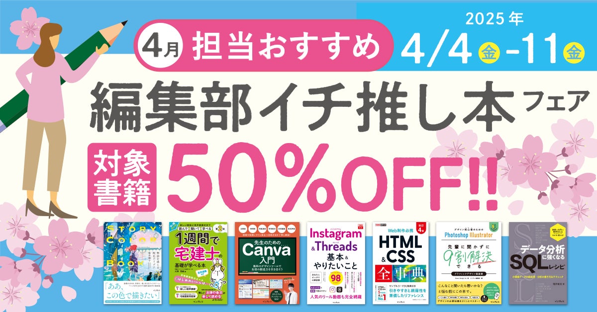 インプレスグループでIT関連メディア事業を展開する株式会社インプレス(本社:東京都千代田区、代表取締役社長:高橋隆志)は、対象の電子書籍が50%オフで購入できる「担当おすすめ!編集部イチ推し本フェア 2025年3月」を2025年4月4日(金)から4月11日(金)まで実施いたします。