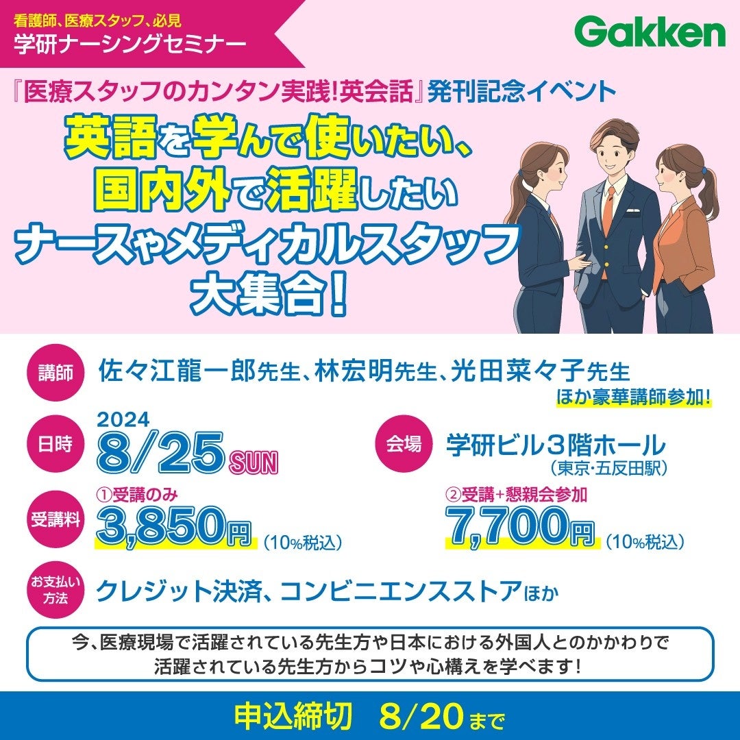 株式会社 学研ホールディングス(東京・品川/代表取締役社長:宮原博昭)のグループ会社、株式会社 Gakken(東京・品川/代表取締役社長:五郎丸徹)は、2024年8月25日(日)に『医療スタッフのカンタン実践!英会話』発刊記念イベントとして、看護師や医療スタッフ向けのセミナーを開催いたします。