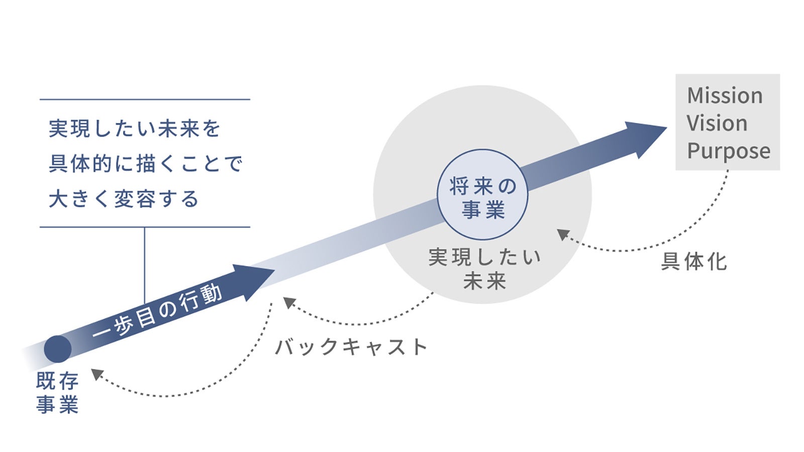 この言語化されたありたい未来の姿をもとに現在の事業や組織のあり方を見直し、今後取り組むべきテーマや方向性を検討、明確化します。構想と現実を往復しながら合意形成を図り、次のアクションへとつなげていく点が特長です。事業変革や研究開発の方向付けに加え、組織風土の醸成や次世代リーダーの育成といった側面にも寄与することを目指します。