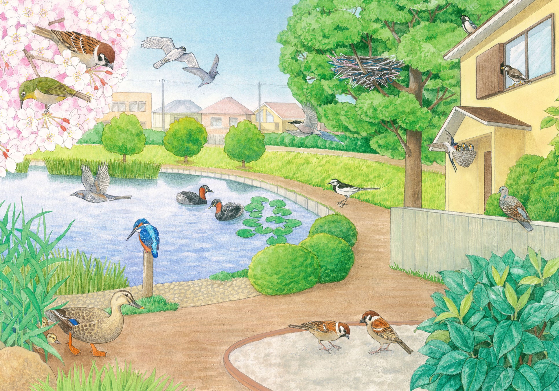 春の公園、夏の森林、秋の里山、冬の池など、季節と場所ごとに、150種以上の鳥たちが登場します。