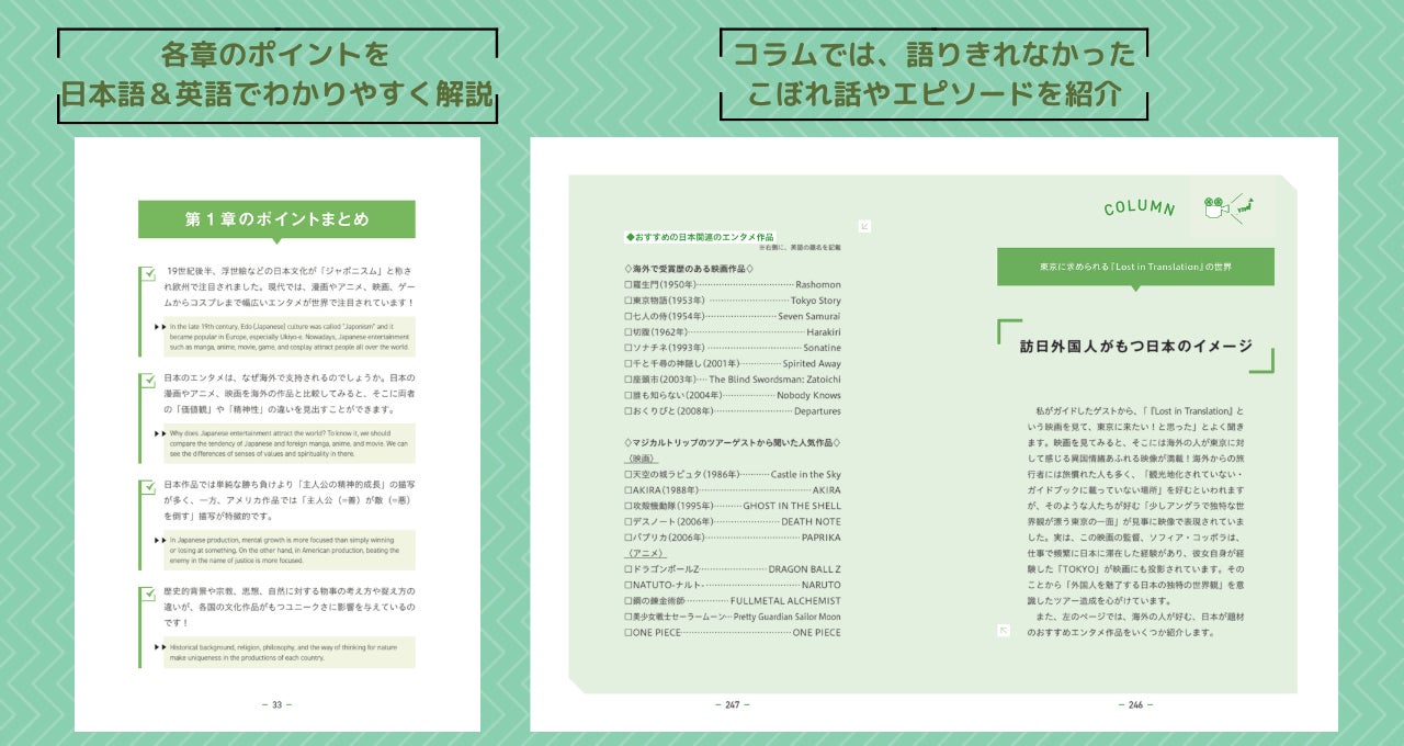 各コラムでは、その章に関するこぼれ話や、著者のインバウンドガイドとしての知識や経験などのエピソードをご紹介。第8章のおすすめの日本のエンタメ作品もぜひチェックしてみてください。