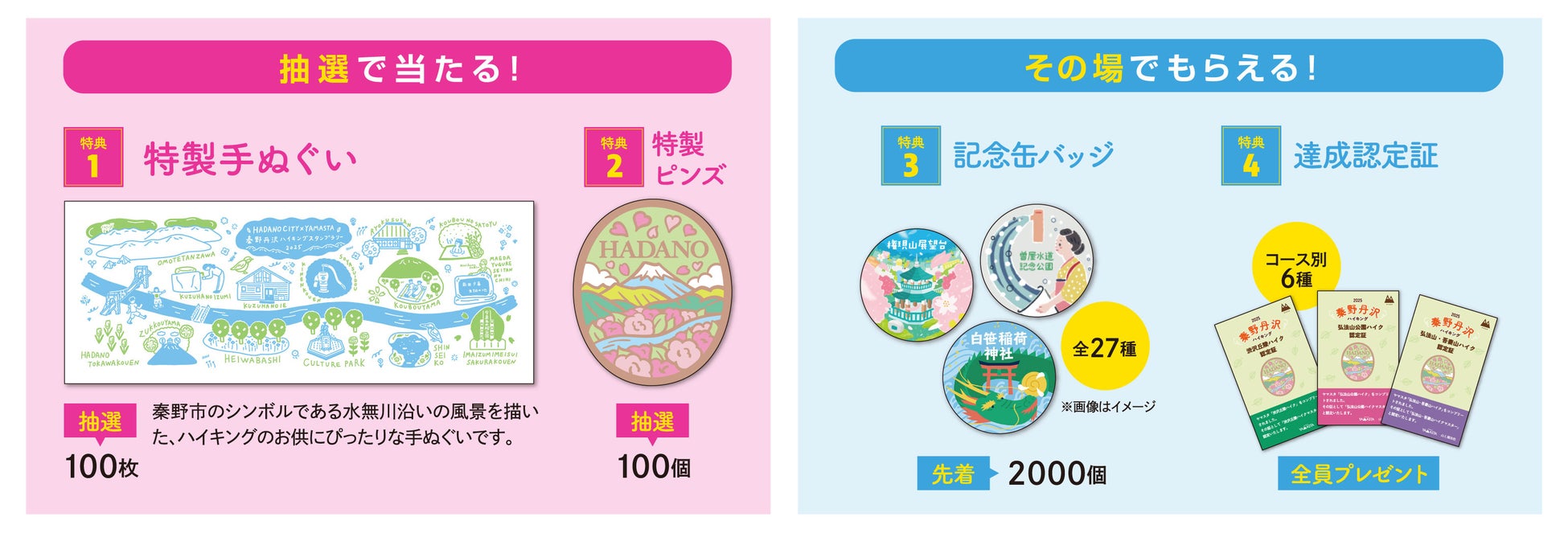 各コースを達成すると、記念缶バッジと達成認定証がもらえます。さらに、抽選で当たる特製手ぬぐいや、山のお土産ブランド「Yamasanka(ヤマサンカ)」とコラボした特製ピンズに応募することができます。