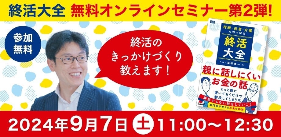 株式会社 学研ホールディングス(東京・品川/代表取締役社長:宮原博昭)のグループ会社、メディカル・ケア・サービス株式会社(埼玉・さいたま市/代表取締役社長:山本教雄)は、2024年9月7日(土)に『相続・遺言・介護の悩み解決 終活大全』(5月23日発売)の無料オンラインセミナーを開催いたします。