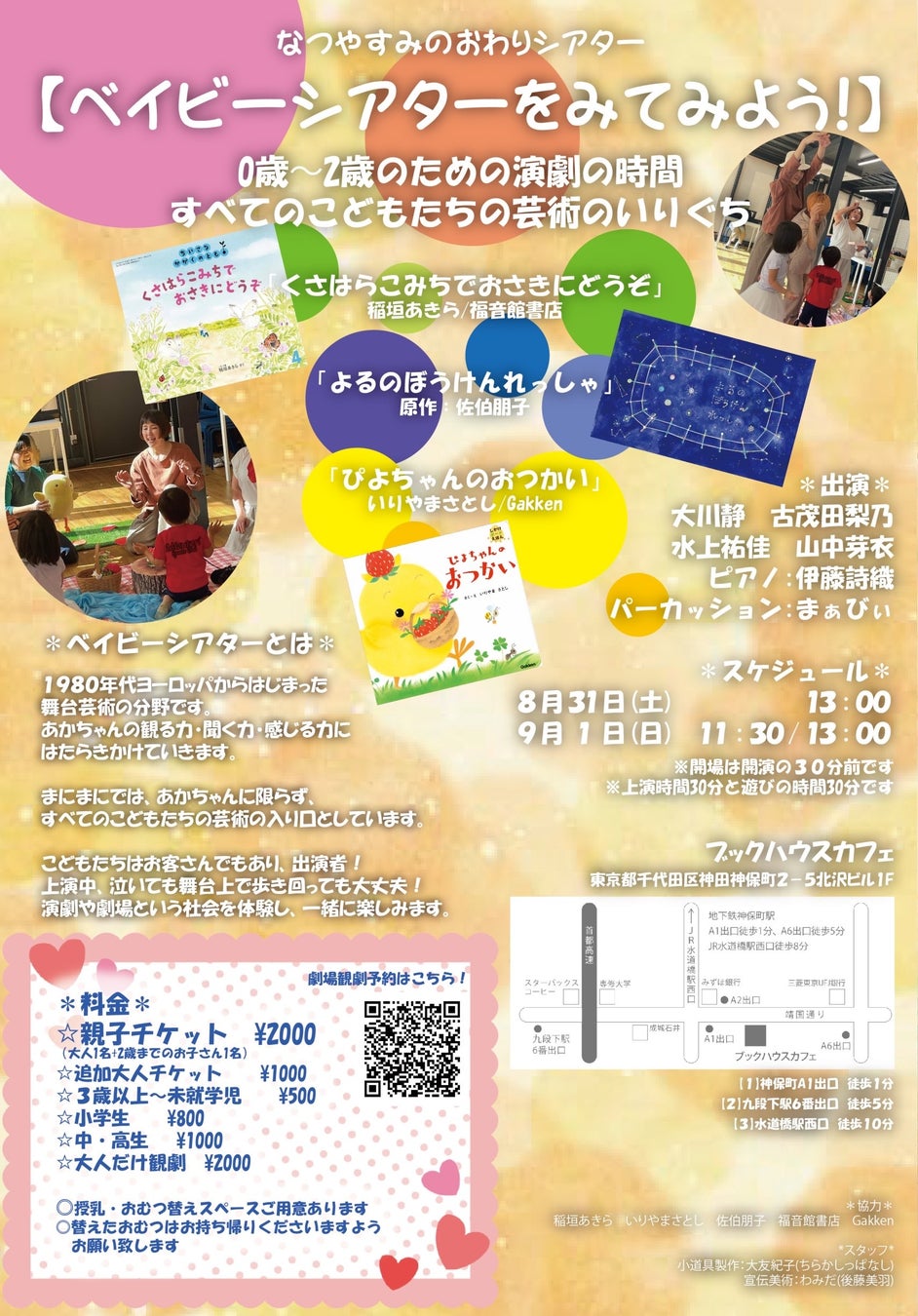 本公演では、0歳から2歳のためのベイビーシアターという特別な演劇体験ができます。ヨーロッパで1980年代から始まったベイビーシアターは、赤ちゃんの観る力・聞く力・感じる力に働きかける舞台芸術の分野です。絵本と演劇のユニット「makaniまにまにlani」では、すべての子どもたちの芸術の入り口として、特に小さな子どもたちとそのご家族に向けた内容を用意しています。夏の終わりに親子で特別な時間を過ごせる機会! ぜひ足をお運びください。