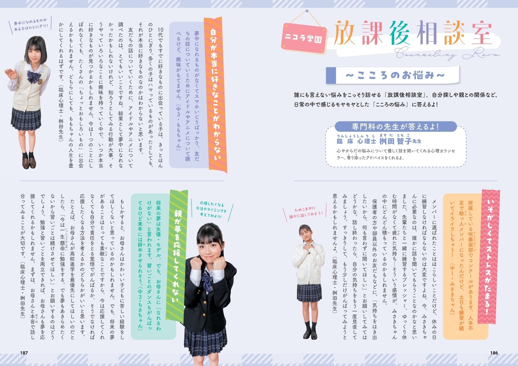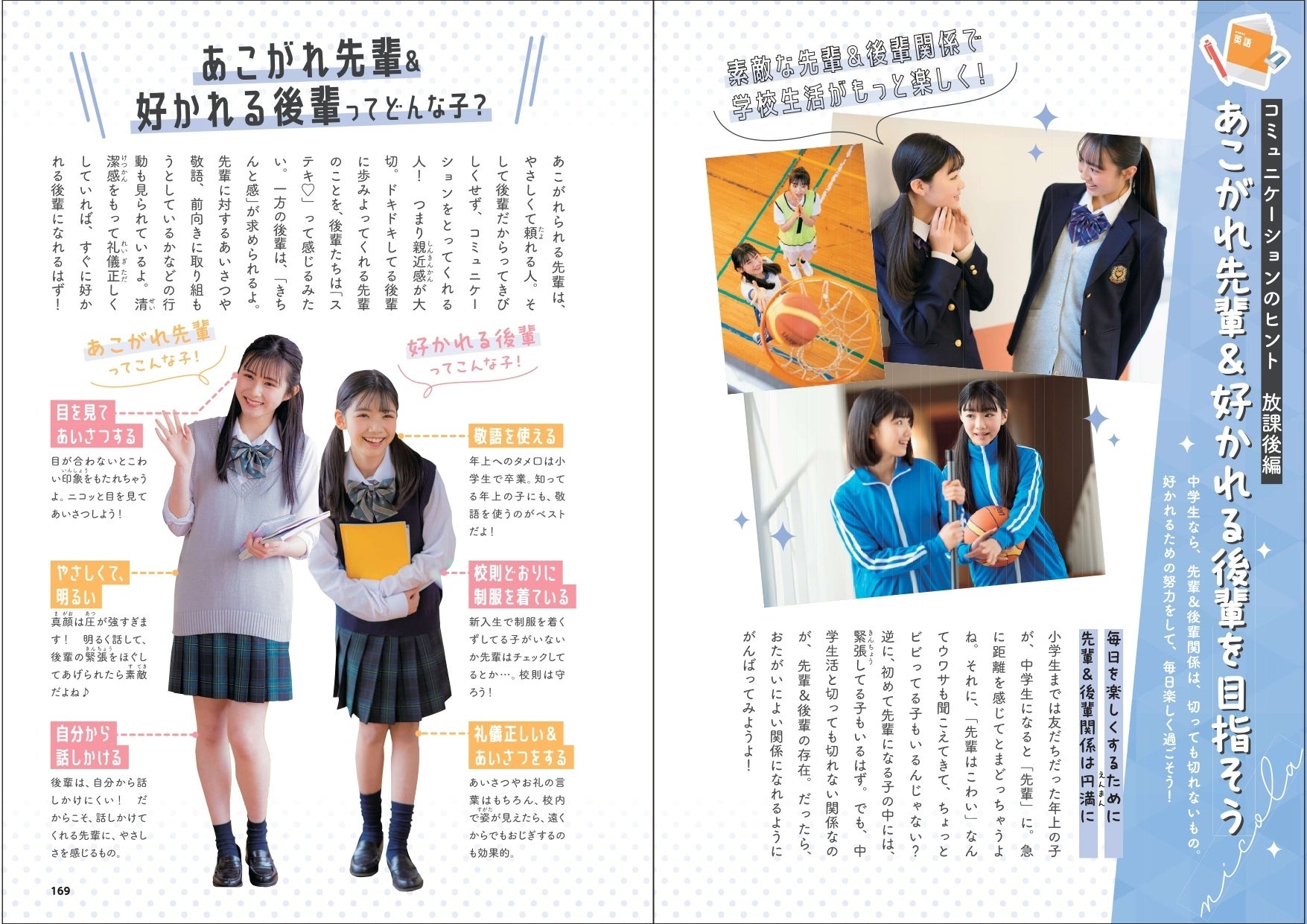 特別コラムとして、ニコラモデルたちを主役にした小説「二コラ学園恋物語」のオリジナルストーリーを収録。甘酸っぱい恋物語は胸キュンすることまちがいなし! ほかにも、ティーンのお悩み相談コーナー「放課後相談室」では、人には話しにくい心やからだの悩みについて、ニコモたちが親身になって相談にのってくれます。また、巻末には中学生読者の声をまとめた「中学生活なんでもデータ」も収録しており、読み応えは十分です。