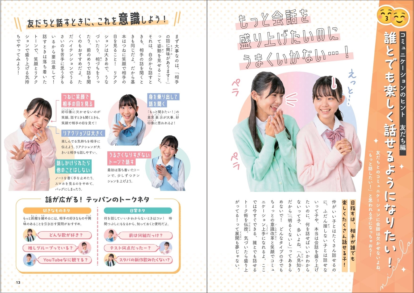 コミュニケーションテクや、学校生活の悩み相談が1冊に! 友だち、好きな人、先輩・後輩…人間関係のお悩みをまるっと解決。新学期からの学校生活がもっと楽しくなるはず!