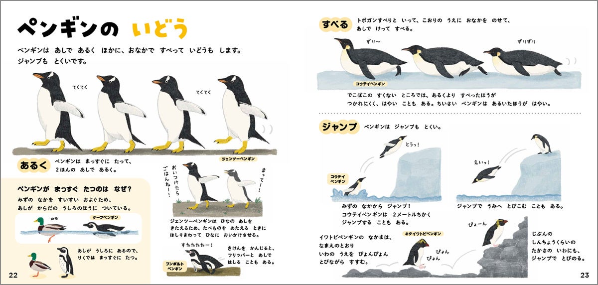 かわいいだけでなく、「ジェンツーペンギンは1秒で10メートルも泳げる」、「コウテイペンギンは小学1年生とほぼ同じ背の高さ」など、ペンギンたちのすごいひみつもたっぷり紹介します。