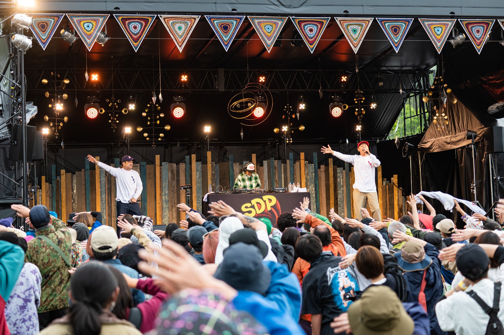 2日目は奥田民生、踊ってばかりの国、GEZAN、スチャダラパー、AJATE、角銅真実、ハンバート ハンバート、んoon、INOYAMALAND、DJ KENSEI、どんぐりず、Hana Hope、YOSI HORIKAWA、Ramzaの計14組が出演。真っ赤な衣装がトレードマークのGEZANは、OLAibiを招いたツインドラムで終始会場を轟音と熱狂の渦へと巻き込んだ。「辞めずに懲りずにやってたら32年やってました!」と笑い飛ばすスチャダラパーは、心のベストテン第一位の「今夜はブギーバック」をはじめフェス定番曲を網羅し、親子で楽しむ光景も見られた。どんぐりずは中毒性のあるトラックメイクで子供も一緒に踊って盛り上がり、Stone stageが入場制限となる賑わいだった。大トリの奥田民生の出番になる頃から突然雨が降り出し、「マシマロ」を”富士山もないけど気にしない!”と歌いながらスタート。雨が激しくなる一方で、雨ニモ負ケズ集まった多くの観客の声援を受けながら、ユニコーンの「ロックンロールのバラード」や「イージュー★ライダー」「さすらい」などの名曲を次々と熱唱した。最後は鳴り止まない拍手に応え、「ありがとう、また来ますので!」と告げ、アンコールに「風は西から」を歌い幕を閉じた。