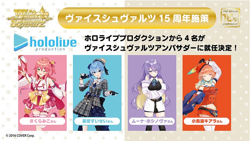 ホロライブプロダクション所属のさくらみこさん、星街すいせいさん、ムーナ・ホシノヴァさん、小鳥遊キアラさんの4名がヴァイスシュヴァルツ15周年をナビゲートするアンバサダーに就任いたしました。