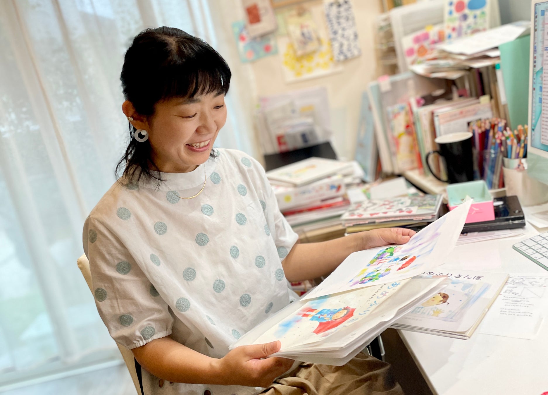 「はじめて作画した絵本『あめふりさんぽ』が数年かけてシリーズになり、10年目にはこんなに立派でかわいい箱につつまれるようになって、とても嬉しいです。お子様やお孫さんなど、みなさんの大切な人といっしょに歩いていける絵本になるといいなと思っています。」