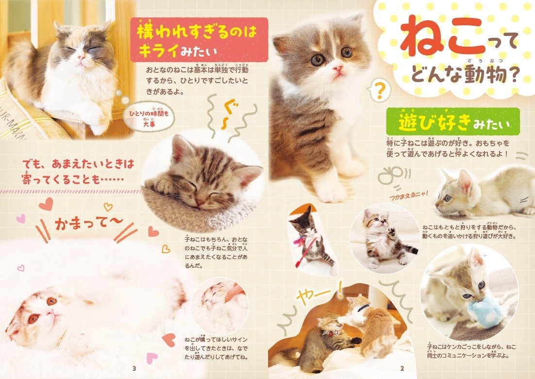 「ねこの1歳は人間でいうとだいたい18歳くらい」、「生まれたばかりのねこの目はみんな青い」、「ねこがにおいをかぐ能力は、人間の20万倍~30万倍優れているといわれている」など、「ねこの豆知識」を各ページに紹介。さらにねこの「品種」や「毛色」についての写真解説や、見ているだけでニコニコしてしまう、かわいい写真もいっぱい。ねこについて詳しくなれる一冊です!