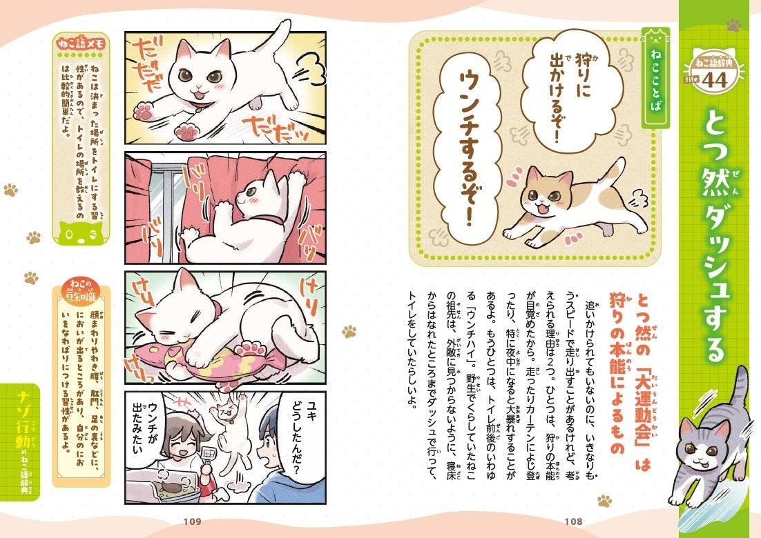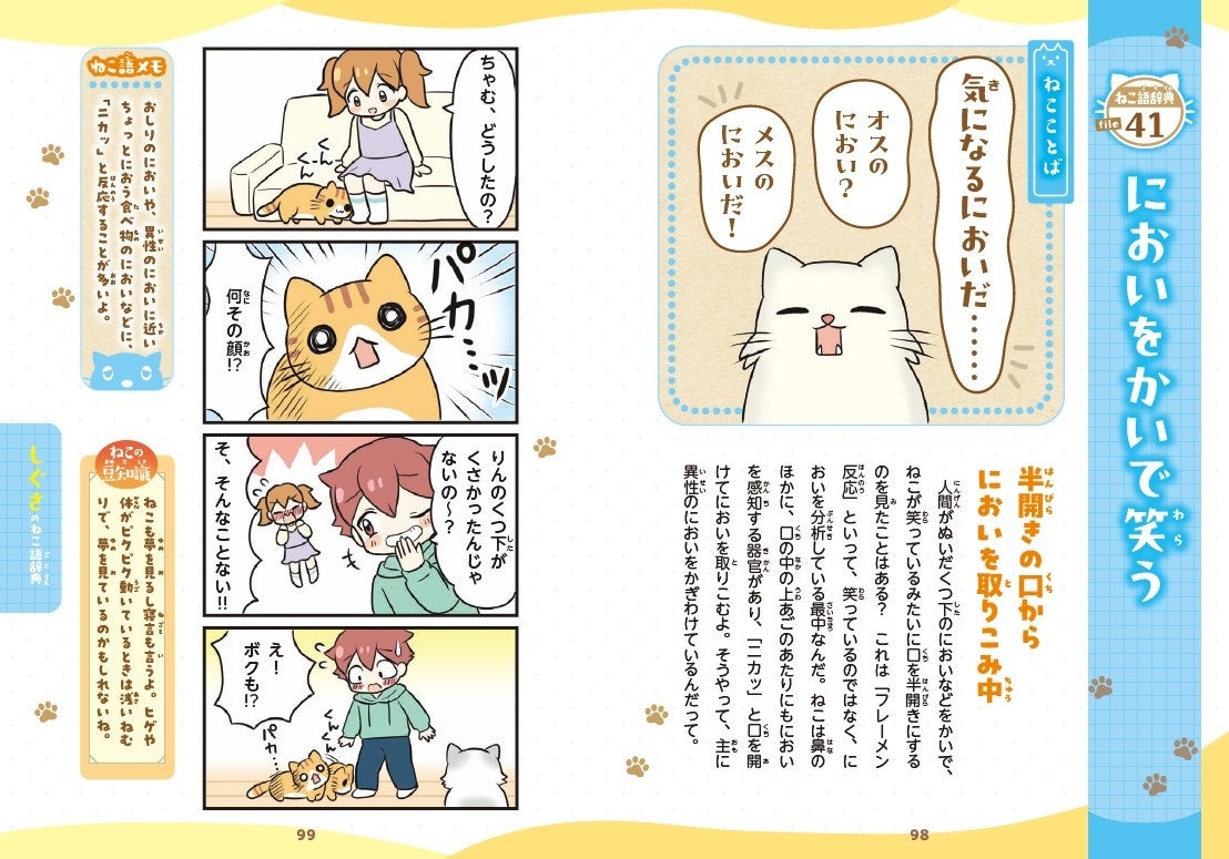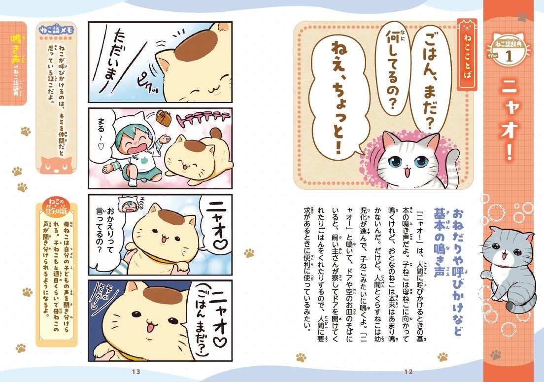 ねこの鳴き声やしぐさから、ねこの本音や気持ちがわかる!?「ねこことば」が楽しくわかる4コマまんがたっぷりの『ねこ語辞典』!
