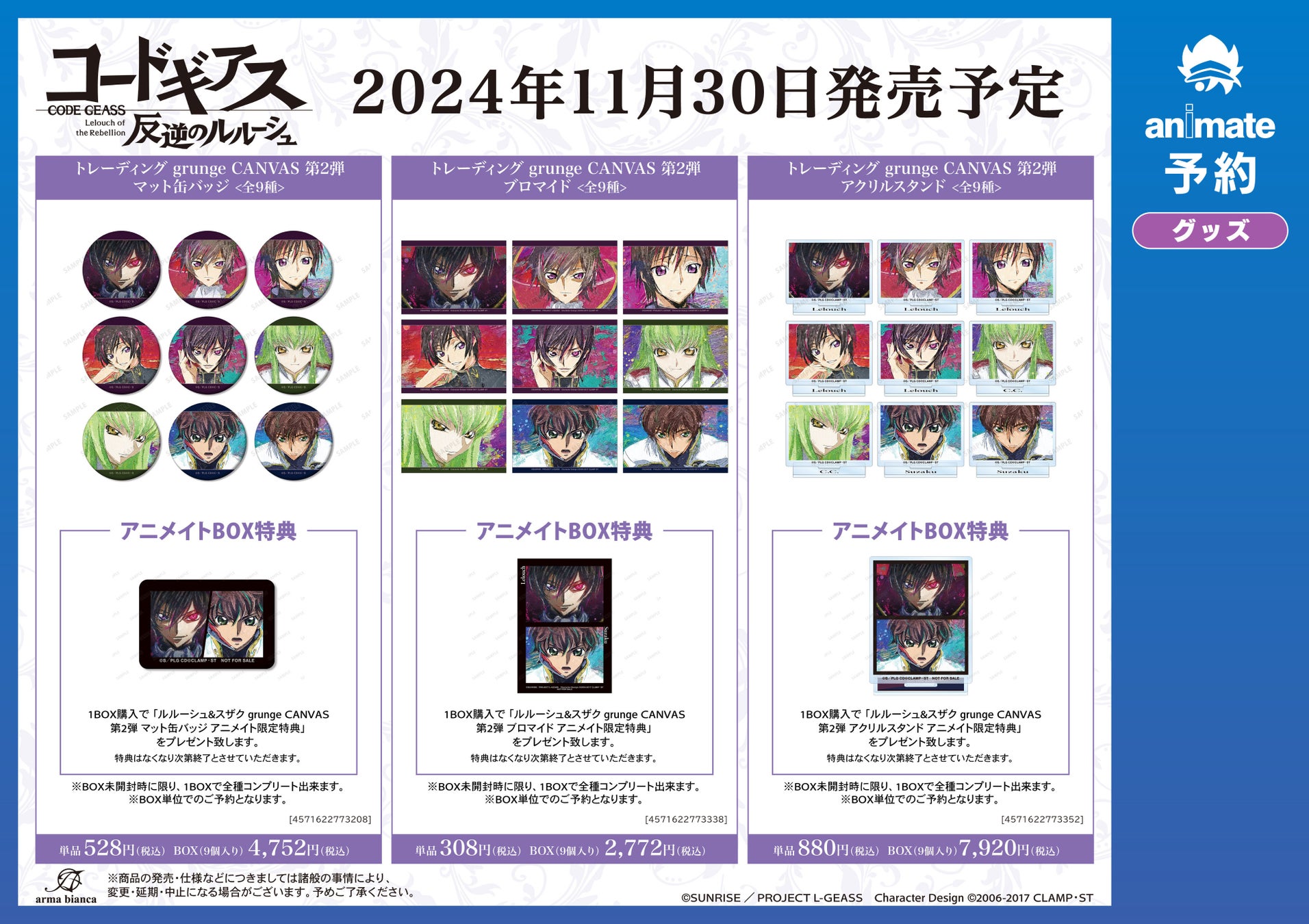 ※11月30日(土)より予約開始予定のECサイト「AMNIBUS」では、BOX購入特典として「ルルーシュ&C.C. grunge CANVAS 第2弾 マット缶バッジ AMNIBUS限定特典」を予定しております。