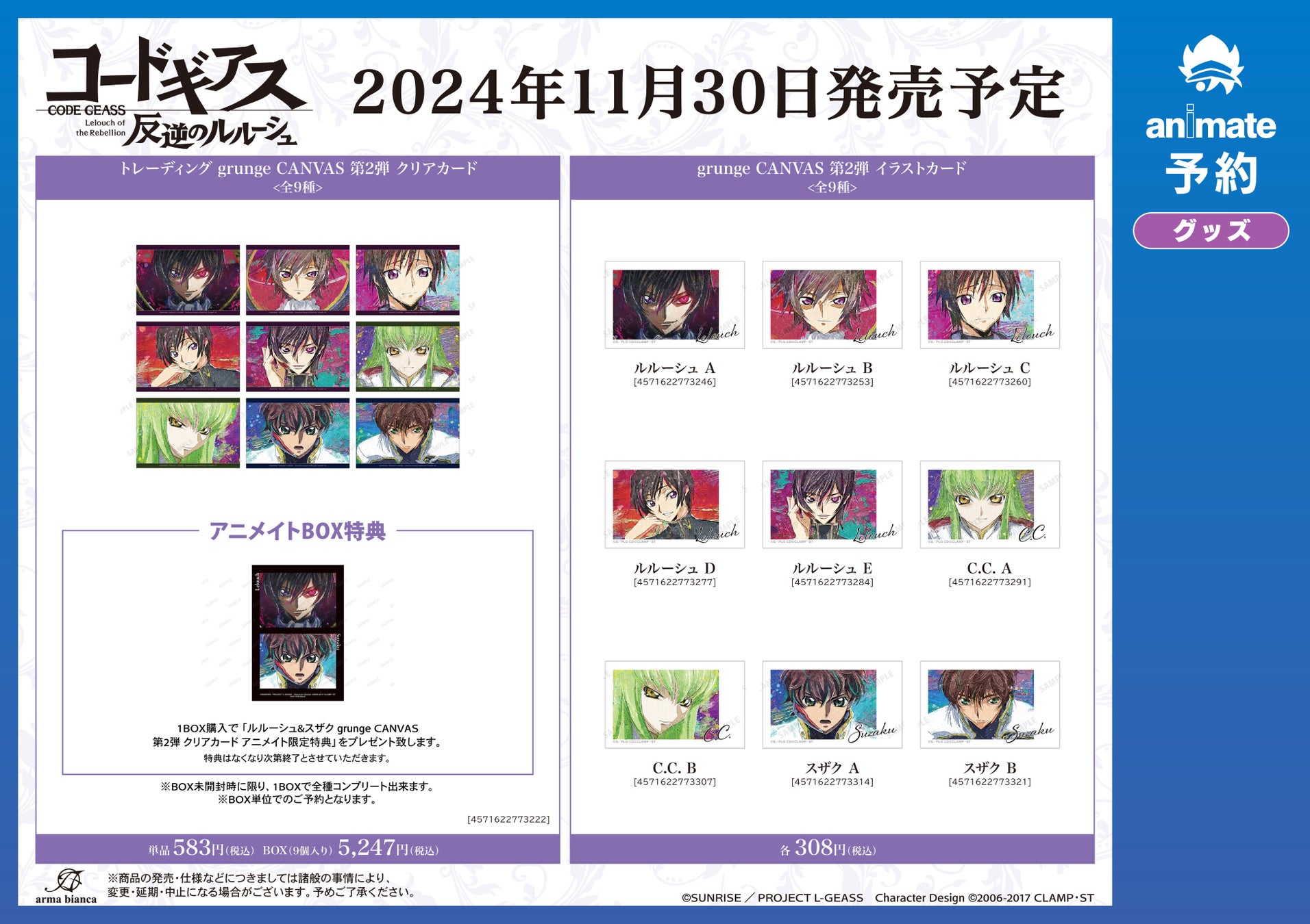 ※11月30日(土)より予約開始予定のECサイト「AMNIBUS」では、BOX購入特典として「ルルーシュ&C.C. grunge CANVAS 第2弾 クリアカード AMNIBUS限定特典」を予定しております。