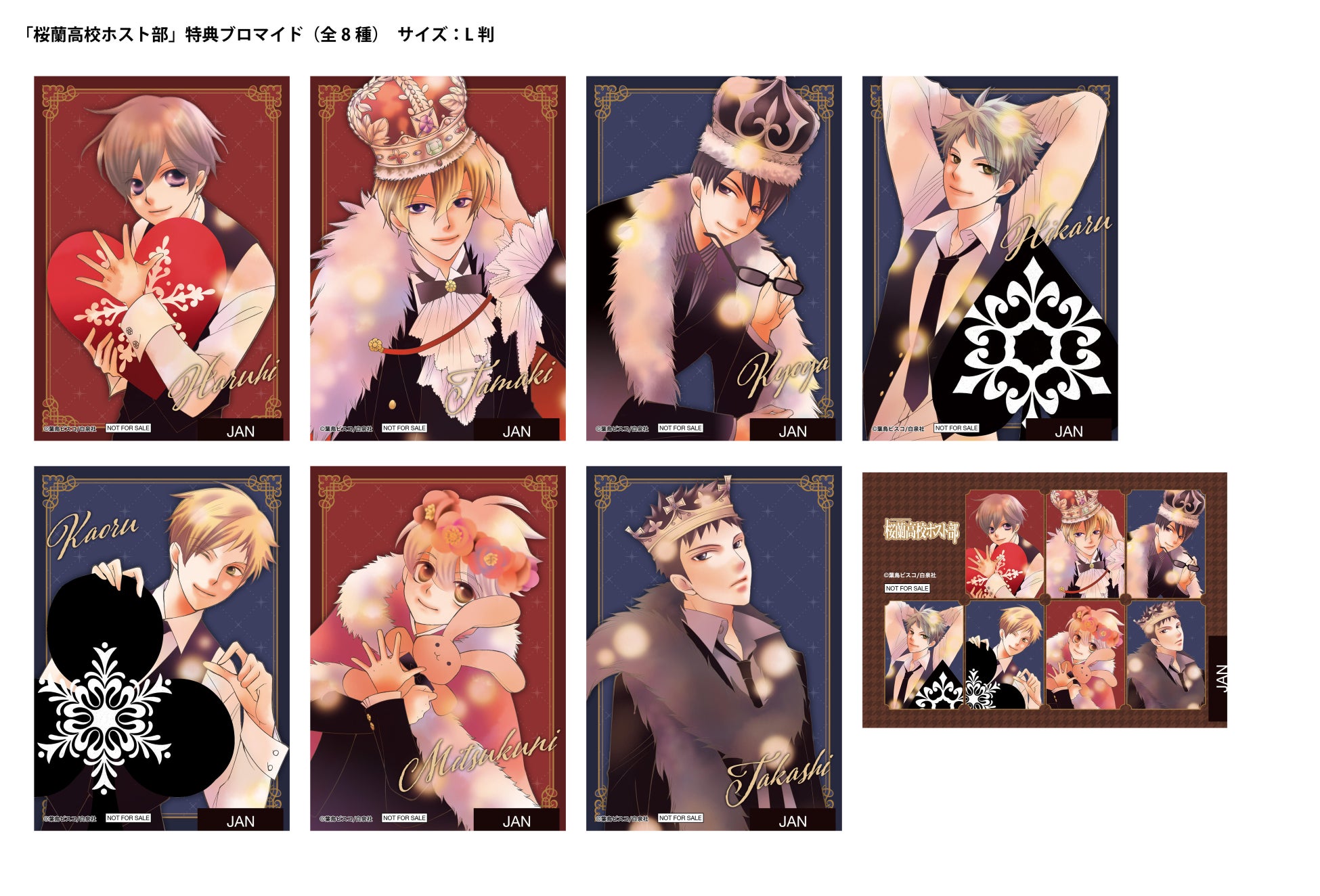 開催内容:期間中『桜蘭高校ホスト部』関連のグッズをご購入・ご予約内金1,100円(税込)毎、書籍・CD・DVD・BDをご購入・ご予約(内金1,100円(税込)以上必須)1点毎にブロマイド(全8種)を1枚プレゼントいたします。