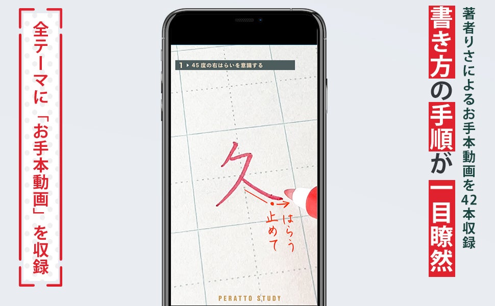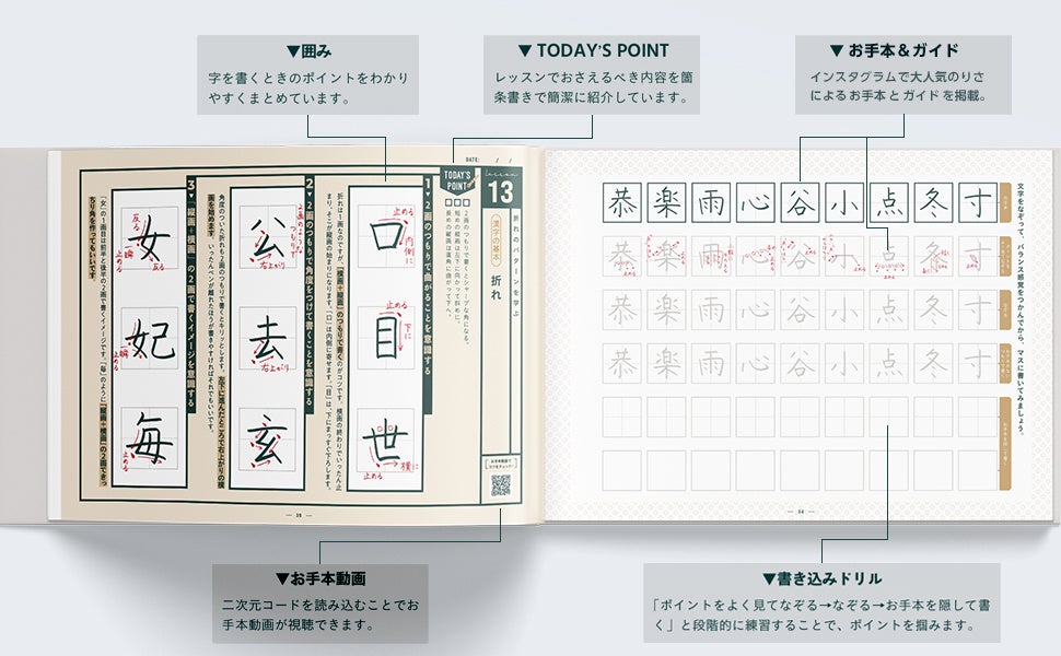 紙面に掲載された二次元コードをスマホやタブレットで読み取ることで、著者による「お手本動画」(42本)を何度でもご覧いただけます。本書で学べる内容を実演しているので、書き方のポイントを順を追って確認でき、とてもわかりやすいです。