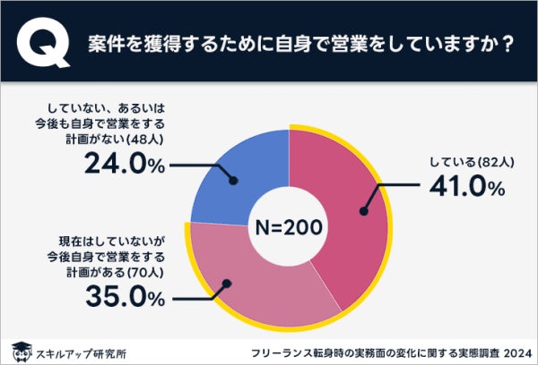 案件獲得にあたり自身で営業を行っているか尋ねたところ、回答者の41.0%が現在自身で営業活動を行っていると回答した。さらに、現在は営業活動を行っていないものの、今後自身で営業をする計画があると回答した層が35.0%を占めた。
