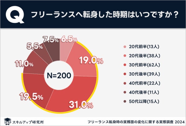 フリーランスへの転身時期を尋ねると、30代前半が31.0%を占め、最も多いことが明らかになった。次いで多いのは20代後半が19.0%、30代後半が19.5%となった。