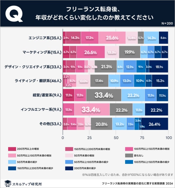 フリーランスへ転身してからどのくらい年収が変化したかを尋ねてみると、各職種で特徴があることが分かった。