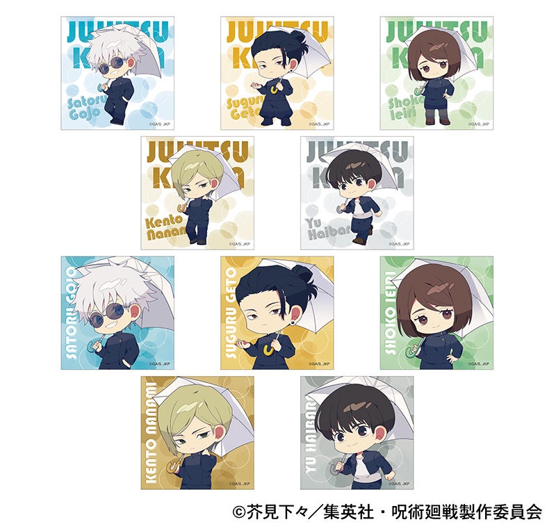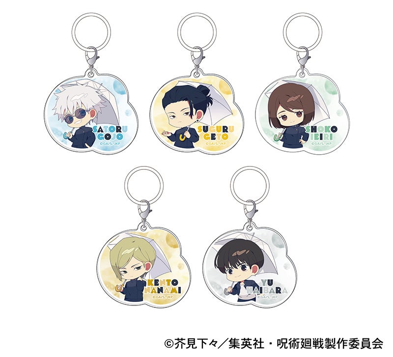 その劇場版総集編「呪術廻戦 懐玉・玉折」が公開されることを記念して、新商品が5月30日より順次発売! 掃除中(?)の五条、夏油、家入、七海、灰原の描き下ろしイラストを使用した「アクリルスタンド」「キャラバッジコレクション」や、“雨の日”をテーマにした描き起こしイラストの「ぺたコレクション」「アンブレラチャーム」など、多数の商品をラインナップしています。