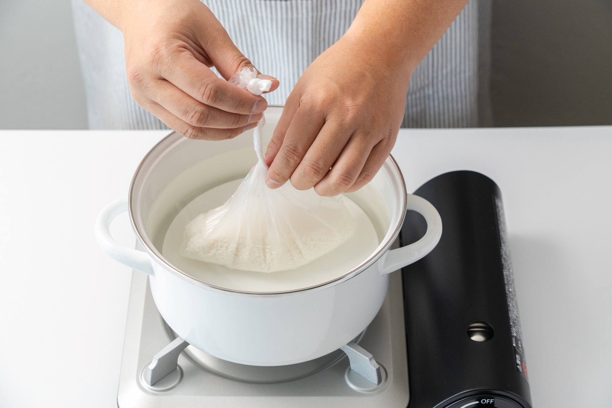 ※湯せんの際に袋が浮き上がってこないよう、空気を抜きます。