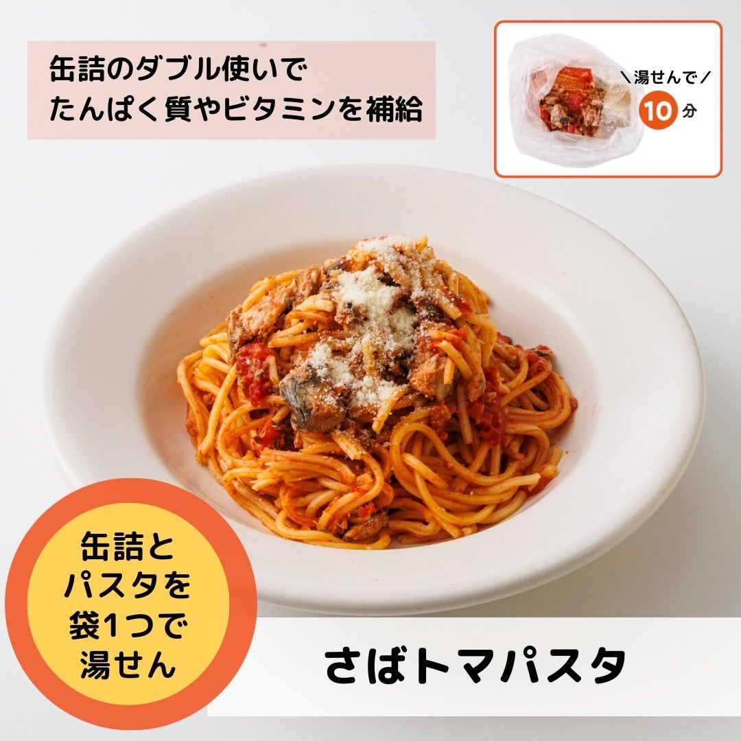 ●アイラップ×備蓄食材レシピ①缶詰でタンパク質やビタミンを補給!「さばトマパスタ」