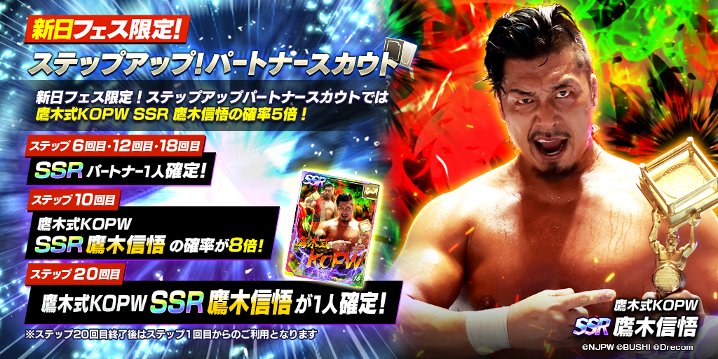 - 新日フェス限定!新SSRパートナーの鷹木信悟選手が登場するステップアップスカウトを開催!