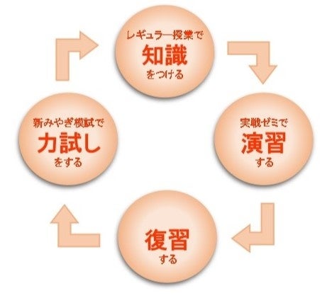 実戦ゼミで問題演習を重ねるだけでなく、受講者には復習を徹底していただきます。個々のレベルに合わせて復習問題を設定し、当日のうちに学習アドバイスをいたします。通常の授業で新しい知識を学び、実戦ゼミで演習と復習を繰り返し、月1回の模擬試験で力試しをすることで、理想的な学習サイクルを確立いたします。
