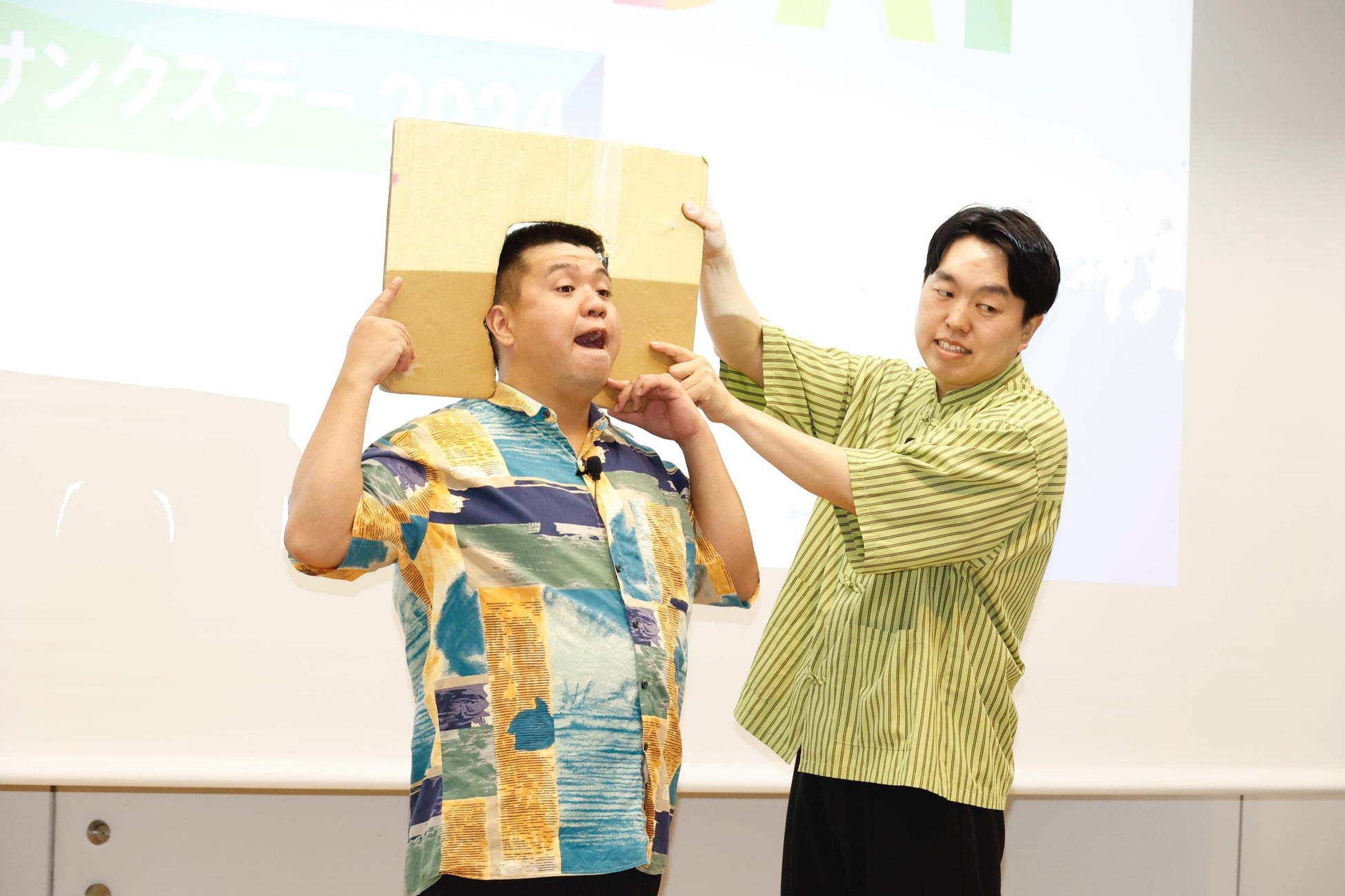 8月2日のハイブリッド開催では、目玉コンテンツとして、吉本興業のお笑い芸人「ジェラードン」さんに学研ビルにお越しいただき、お笑いショーを行いました。また学研グループの理解を深めるクイズ大会や、豪華景品が当たるビンゴ大会を行い、たくさんの笑顔があふれました。
