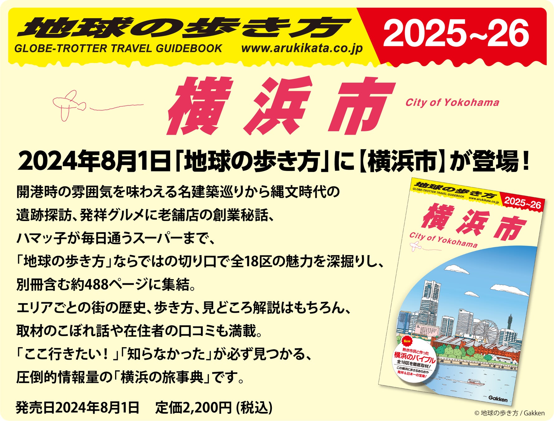横浜市と株式会社地球の歩き方が連携協定を締結し制作。2023年10月に「地球の歩き方」で初の試みとなる市民参加型アンケートを実施し、横浜ファンの声を盛り込むことでより深い横浜の魅力が詰まった一冊となっています。開港時の雰囲気を味わえる名建築巡りから縄文時代の遺跡探訪、老舗店の創業秘話やハマッ子が毎日通うスーパーまで、「地球の歩き方」ならではの切り口で全18区の魅力を深掘りし、別冊含む488ページに集結。エリアごとの街の歴史、歩き方、見どころ解説はもちろん、取材のこぼれ話やハマッ子の口コミも満載。「知らなかった」がきっと見つかる、圧倒的情報量の「横浜の旅事典」です。