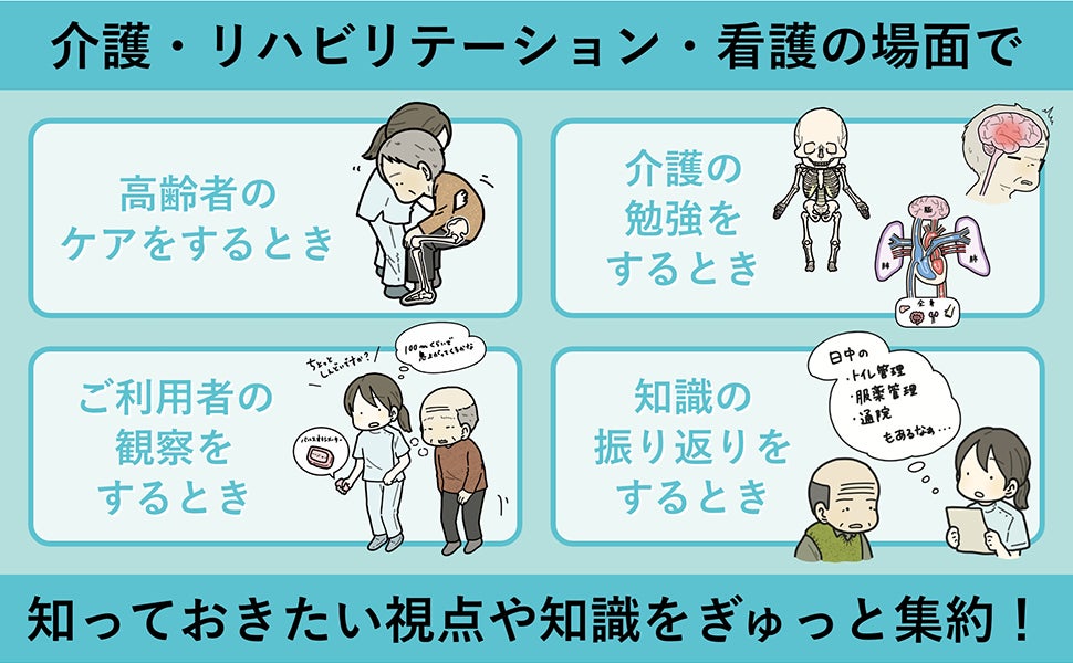 病院や施設、自宅での「あるある」を描いたイラストやマンガを収録しているため、「あれ、なんだっけ?」と思ったときにページをパラパラとめくって眺めるだけでも、高齢者とかかわるときのさまざまな場面で役に立ちます。
