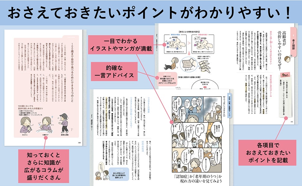現役理学療法士が加齢による高齢者のからだの変化や病気、こころのケアについてイラストでわかりやすく解説しています。