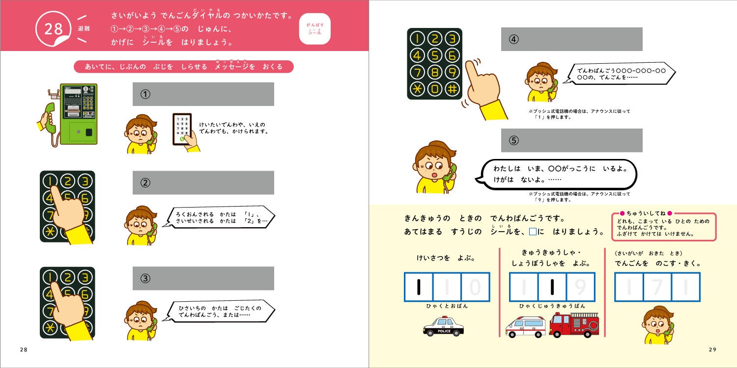 公衆電話の使い方(災害用伝言ダイヤルのかけ方)や、エレベーターに閉じ込められたときの行動など、いざというときの知識を身につけます。避難場所の確認や、ご家庭のルールなどを話し合う機会にもなります。