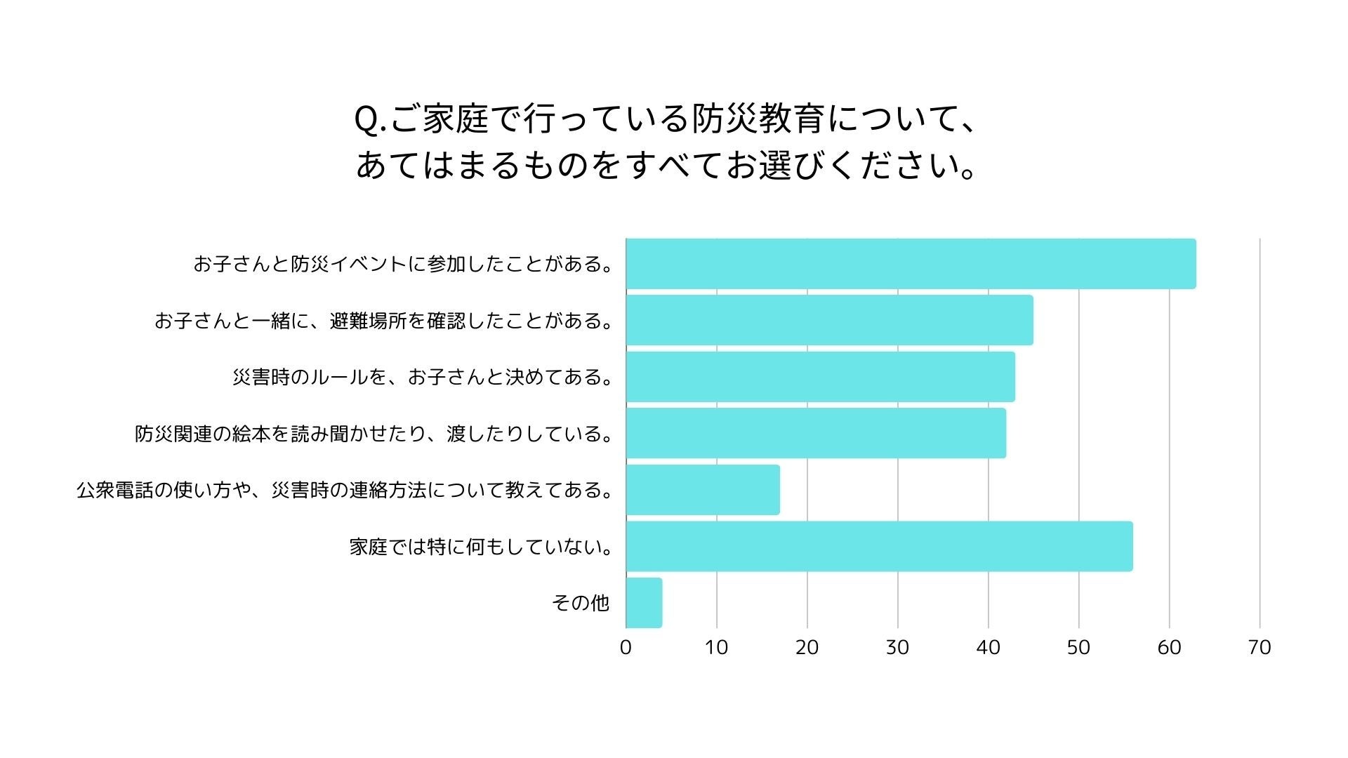 その結果、ほぼすべての保護者(145名中143名)が、家庭で防災教育をする必要性を感じており、全体の6割の保護者は、実際に防災関連の絵本の読み聞かせや、防災イベントへの参加など、家庭で防災教育を行っていました。
