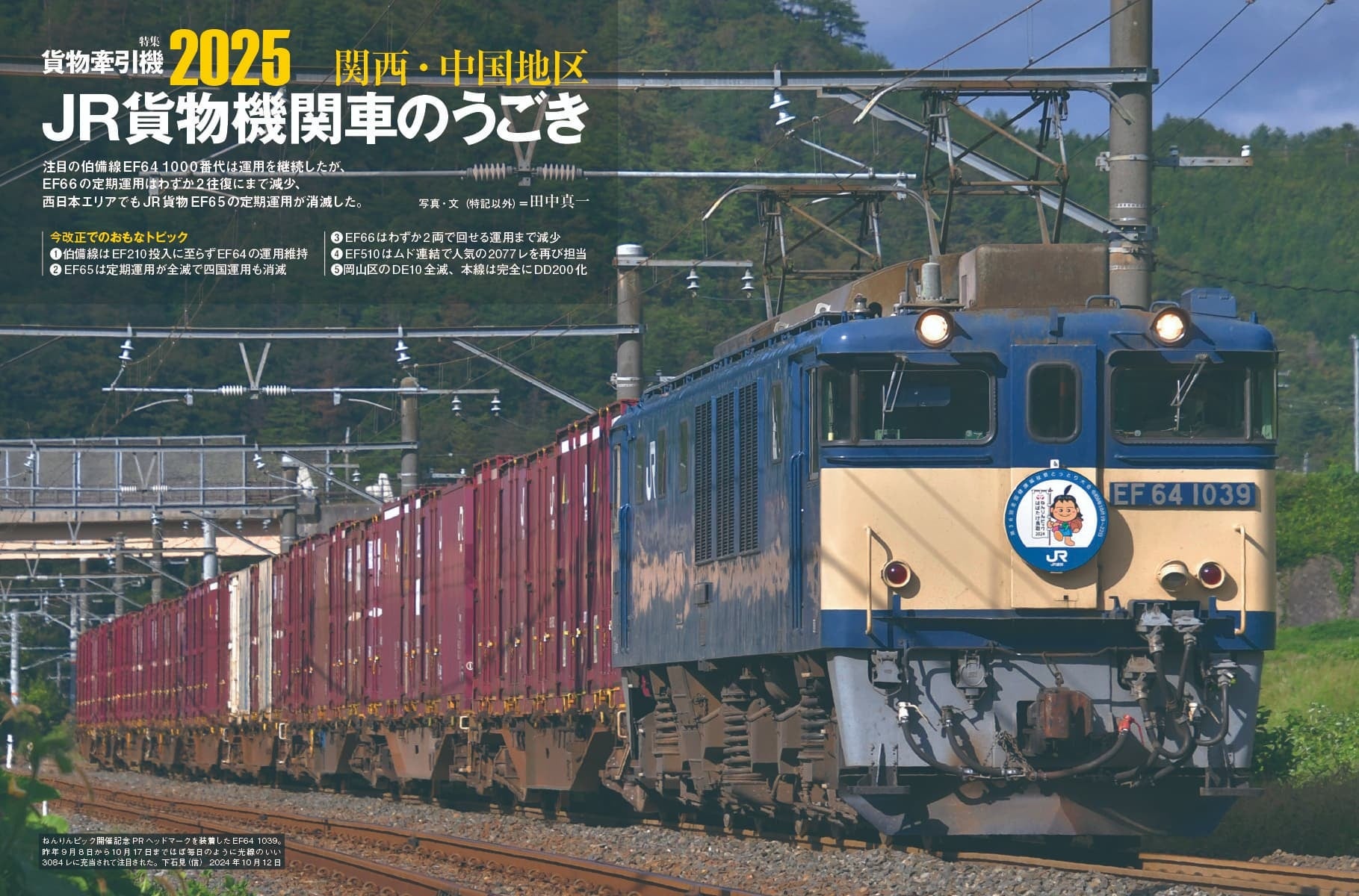 [特集]貨物牽引機2025/激動のダイヤ改正ダイジェスト/黒崎→長万部北海道新幹線向け150mレール輸送開始/JR貨物機関車のうごき 首都圏・中京・関西・中国地区/東京の空の下、軌道は走る 第6回 新宿/大久保営業所/新連載 夜話 新幹線成功への物語05/新連載 新幹線保守用車総合データベース マルチプルタイタンパー(1)/国鉄末期~民営化後0・100 系編成の変遷 〔後編〕/新性能電車の系譜 第14回郵便・荷物電車 クモユ・クモユニ・クモニ/私有コンテナファイル UM11A-1000番代/UM12A-0番代/新聞社が見た鉄道 関西の鉄道 昭和45年/特別付録 2025全国貨物列車機関車運用表