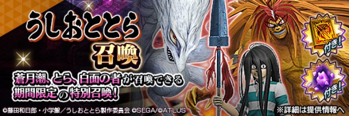 期間中、新★5コラボキャラクター「蒼月潮」「とら」「白面の者」をラインナップに含む“うしおととらステップアップ召喚”や“うしおととらジェム召喚”といった特別な召喚を開催します。