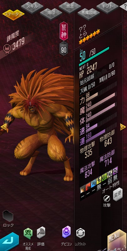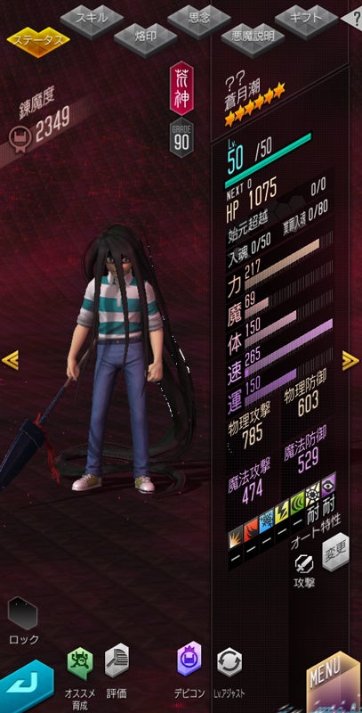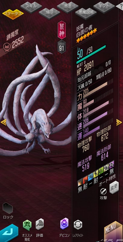 呪殺貫通を得る。最大HPが50%増加。すべての状態異常にかからなくなる。腐食の霊鎖を2カウント軽減する。受けるダメージ40%減少。ダメージを与えたとき、終末戦争以外でプレスターンアイコンを消費しない。(1ターン中2回)