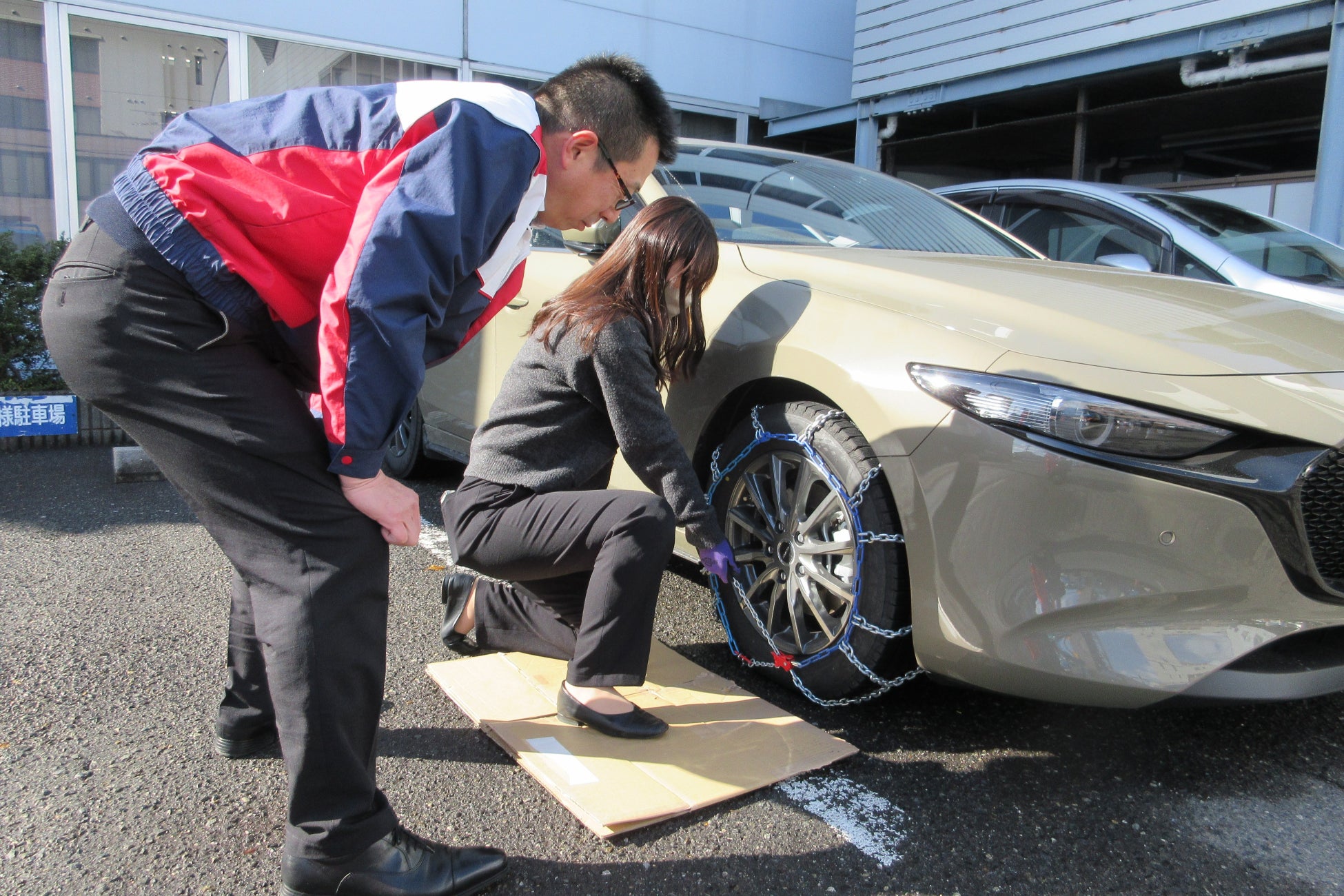 本教室では、実際にご自身の車両でタイヤチェーンの取り付け方法を確認しながら、正しく装着できるようアドバイスを受けることができます。