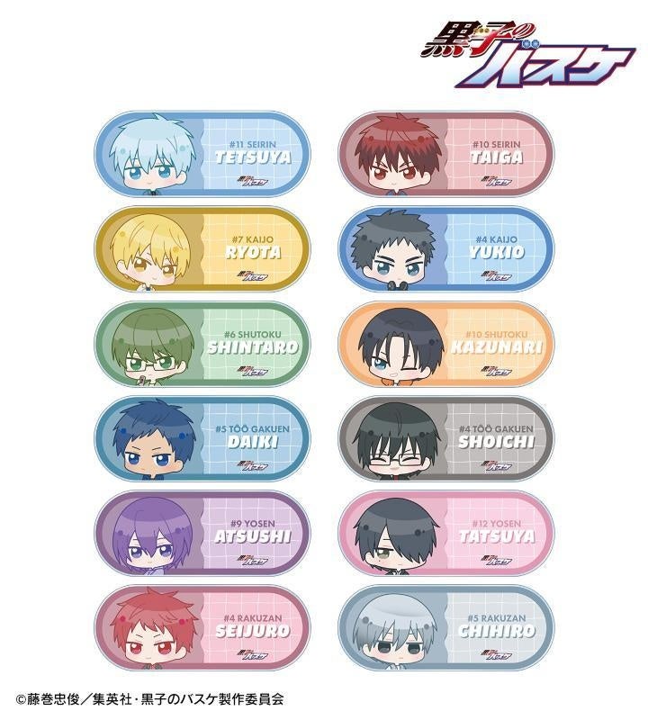種類 :全12種(黒子テツヤ、火神大我、黄瀬涼太、笠松幸男、緑間真太郎、高尾和成、青峰大輝、今吉翔一、紫原 敦、氷室辰也、赤司征十郎、黛 千尋)