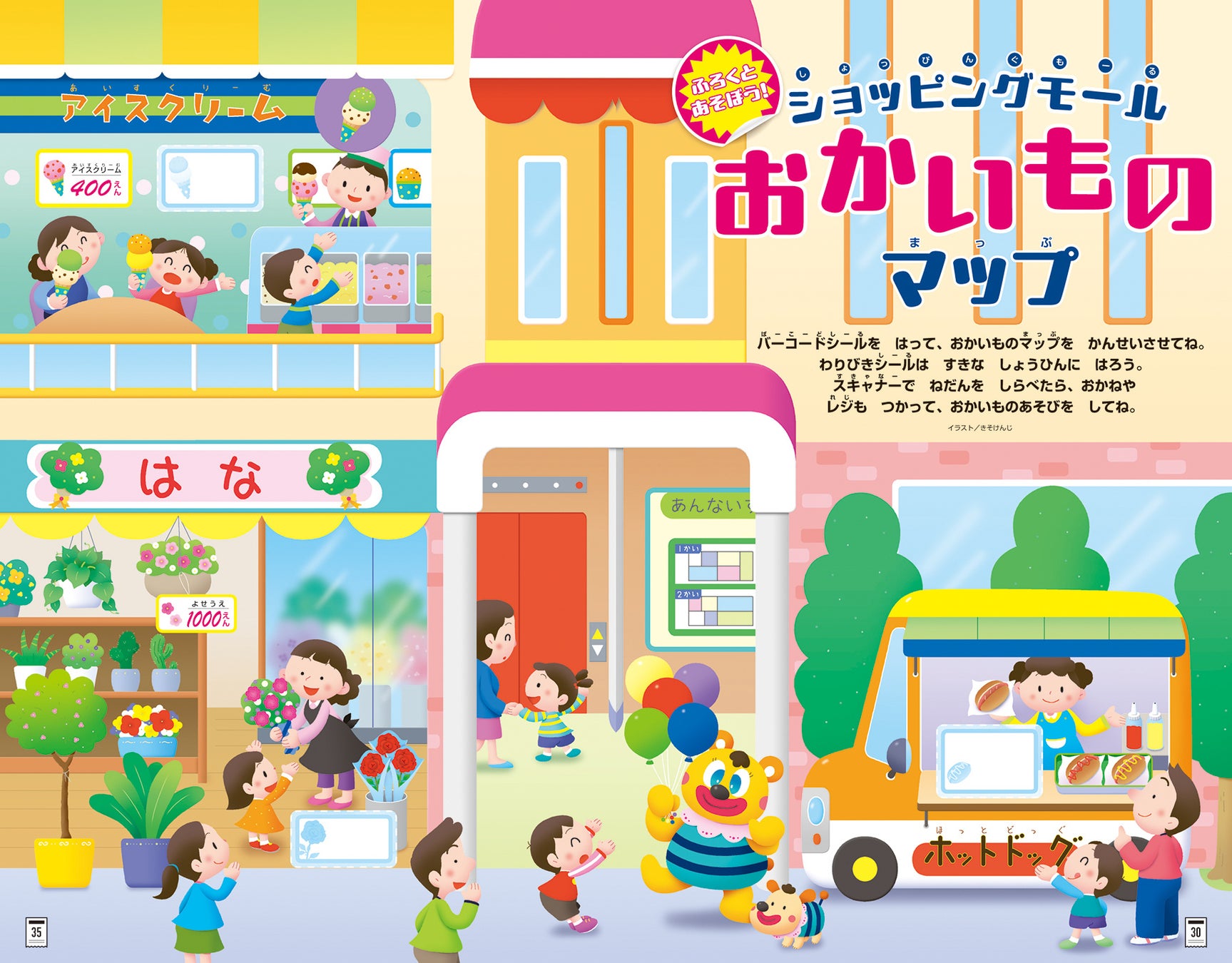 付録のバーコードシールをイラストに合うお店に貼ってお買い物あそびをしてね。