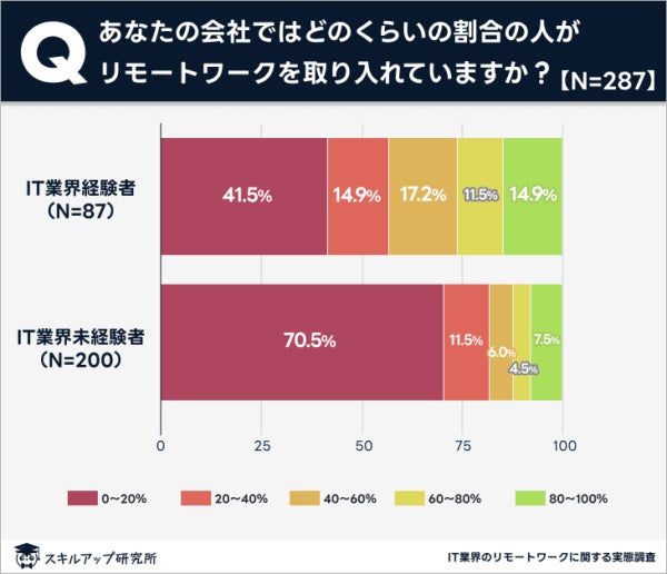 まず、会社でリモートワークを取り入れている方が0~20%だと回答した方の割合について、IT業界経験者は41.5%、未経験者は70.5%と回答した。