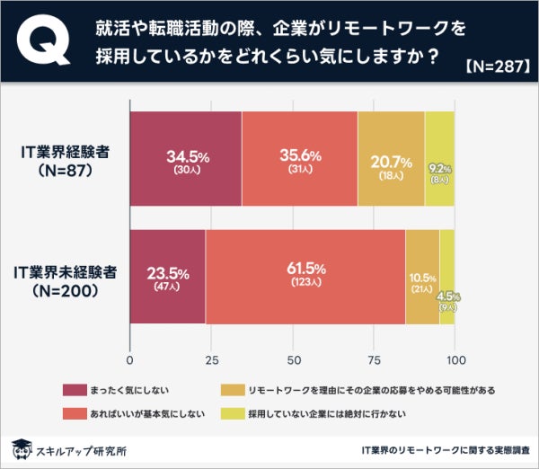 これを明らかにするため、「就活や転職活動の際、企業がリモートワークを採用しているかをどれくらい気にしますか?」という質問をしたところ、IT業界経験者では約70%、IT業界未経験者では85%がリモートワークかどうかは気にしていないことが分かった。
