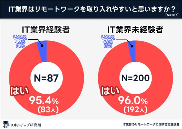 「IT業界はリモートワークを取り入れやすいと思いますか?」という質問に対し、IT業界の経験を問わず90%以上の方が「はい」と回答した。