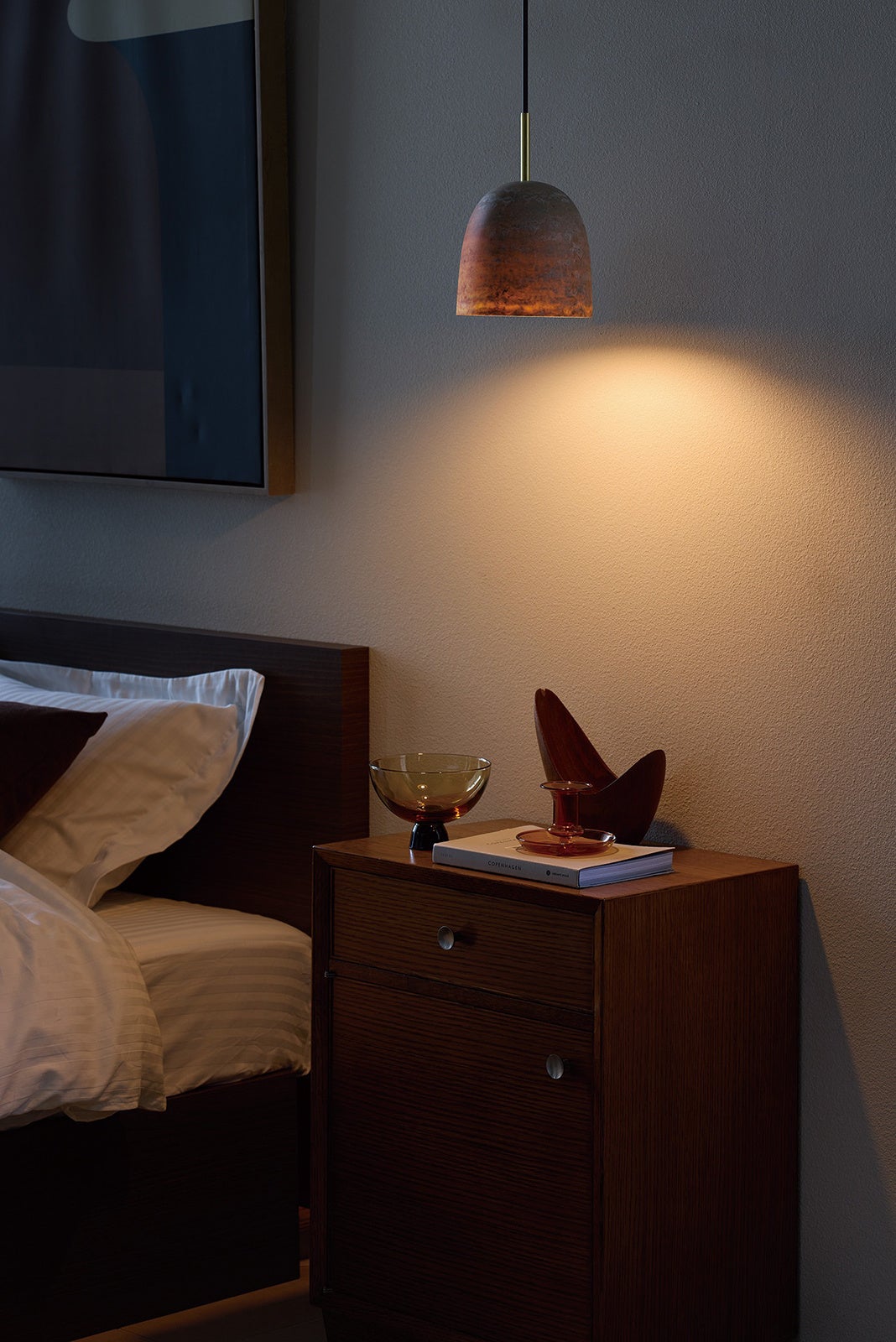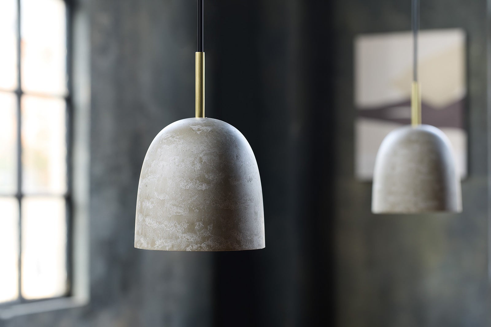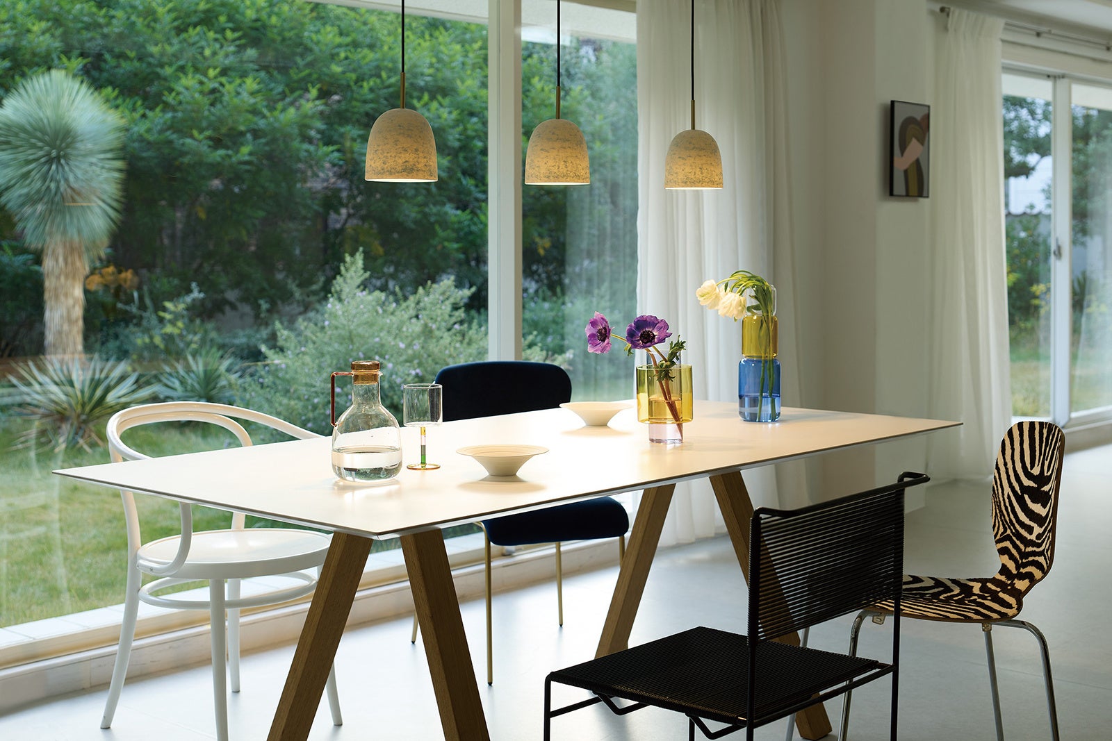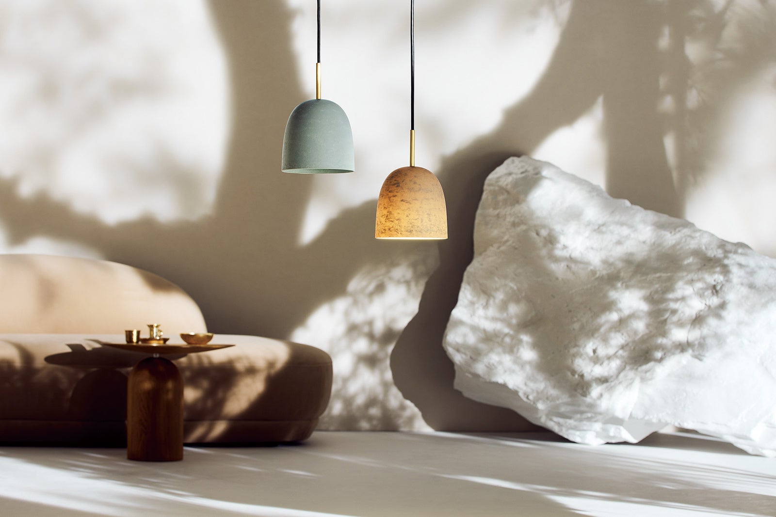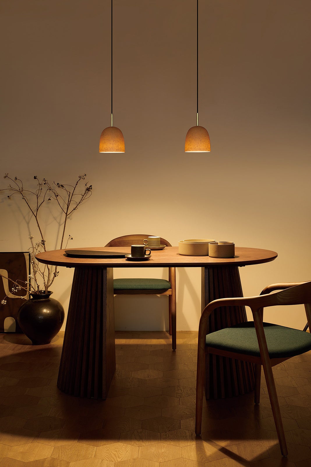 本製品はセードにこの「kinari」を採用したペンダントです。セルロースファイバーを約50%含有し、セード部分の石油由来樹脂の使用量を半減(※)できます。自然素材がもたらす素材の温かみを活かし、成形時にランダムに生まれるマーブル模様をあえてデザインとして取り入れています。これにより、量産品でありながら一台一台表情が異なる自然な個性を楽しむことができます。点灯時には光が柔らかく透過し、鉱石のような丸みを帯びた造形が空間に穏やかな表情を生み出します。また、「kinari」には色調や香りに自然素材由来の風合いがあり、時間とともに変化し、素材が育っていくような趣きを味わえます。