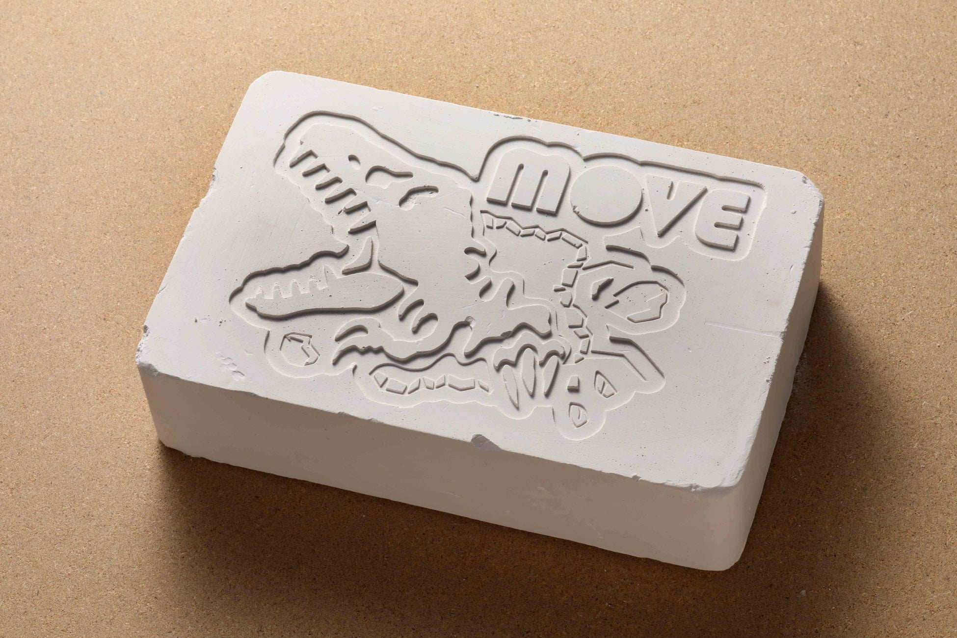 恐竜の化石おもちゃが入った石膏ブロック。付属するノミやハケを使用して、ブロックを削って化石パーツを慎重に取り出そう。化石パーツは全部で10ピース。組み立てて、恐竜の姿を再現しよう。