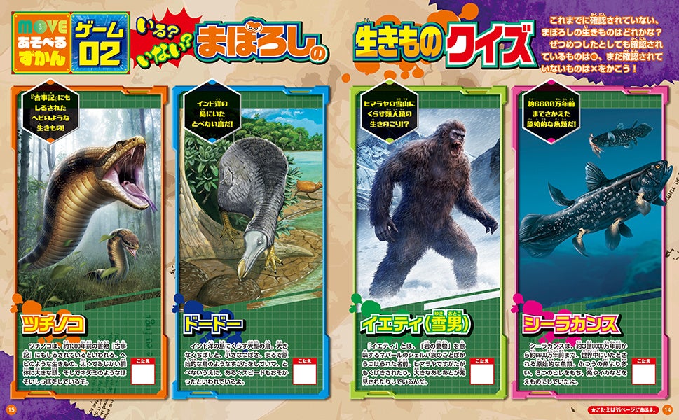 ムックの誌面では、『MOVE』の人気コンテンツが大集合! 「恐竜」や「危険生物」、「宇宙」など、MOVE世代のお子様に人気があるジャンルを横断的に掲載しています。また、「まぼろしの生きもの」や「恐竜」をテーマにしたクイズも掲載。楽しみながら、知的関心が高まります。